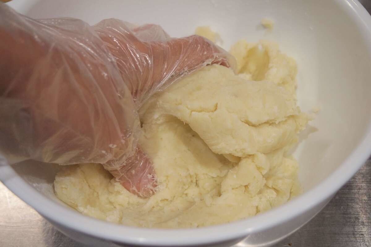 裏ごしたじゃがいもに片栗粉、塩を加え、しっかりこねます