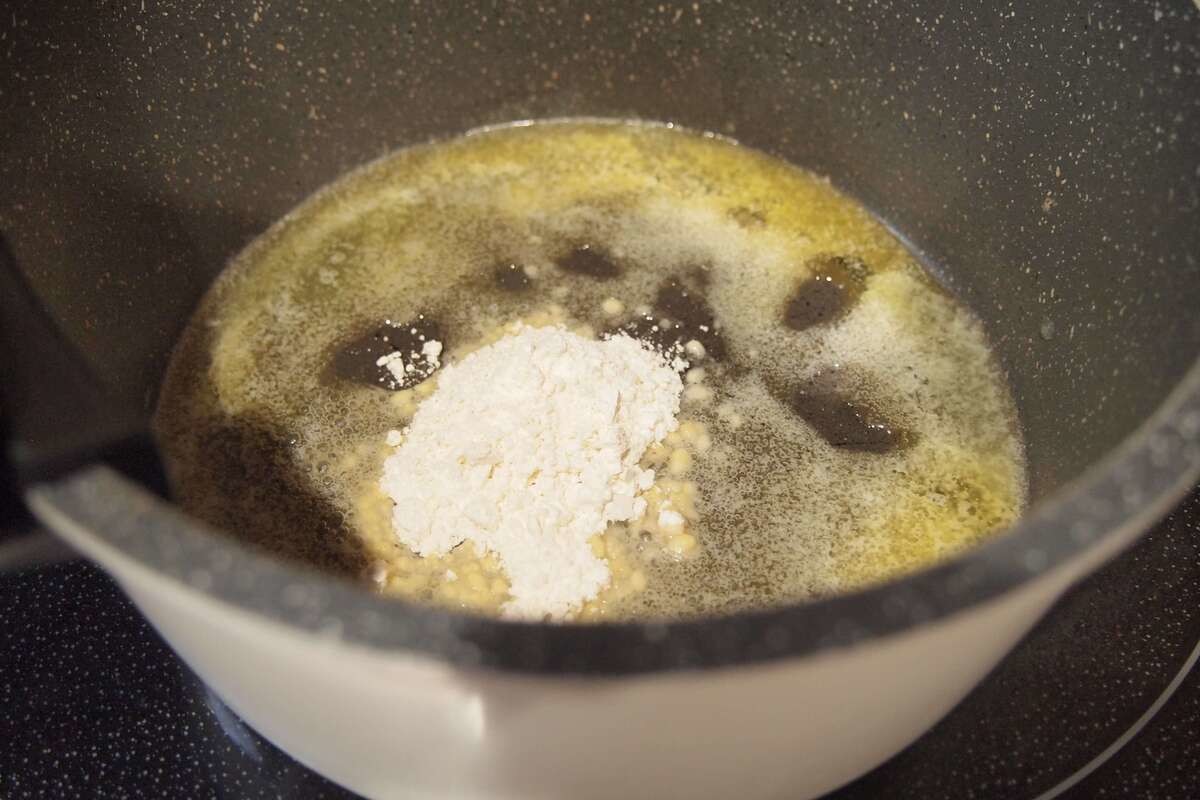 弱火であたためた鍋にバターを入れて溶かし、小麦粉を加えて1分炒めます。
