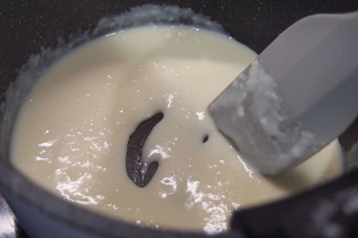 そこに牛乳を少しずつ加え、とろみが出てくるまで混ぜ続けましょう。