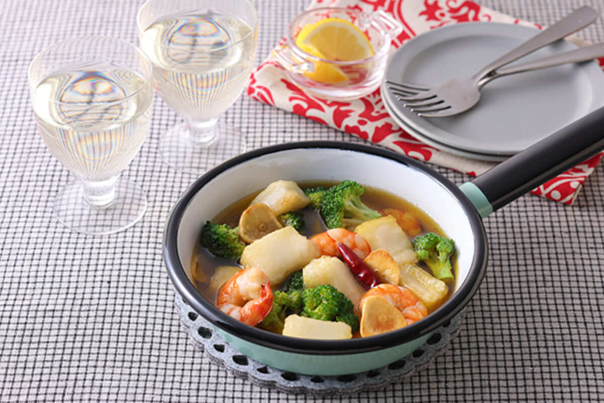 - おもちとえびのアヒージョ