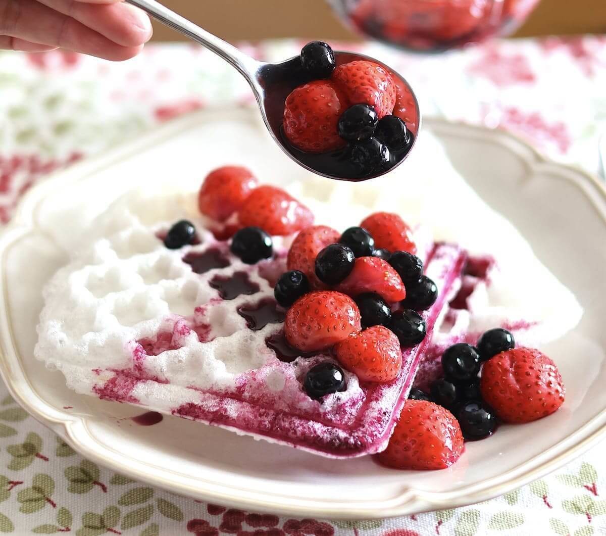 ④ワッフルメーカーを温め、③を挟んで2~3分焼く。焼けたら、②のコンフィチュールをかける。