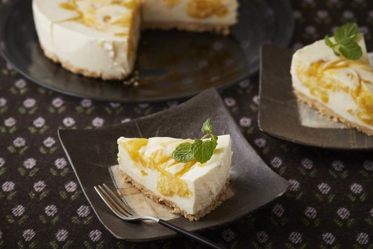 ①グラハムビスケットはフードプロセッサーなどで粉々にして溶かしバターをあわせて混ぜ、ケーキ型の底面に敷き詰め、冷蔵庫で冷やしておく。