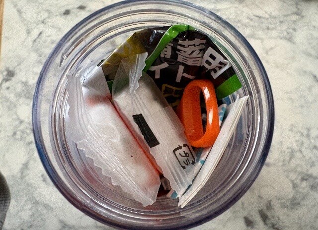 警視庁災害対策課の防災ボトルを参考にしながら、今回この内容にしたのは、冬にコタツの下などに隠れ、もし閉じ込められた隙間の中でも、近くにあったら少し心強いと思える最低限のものを選んでみました。