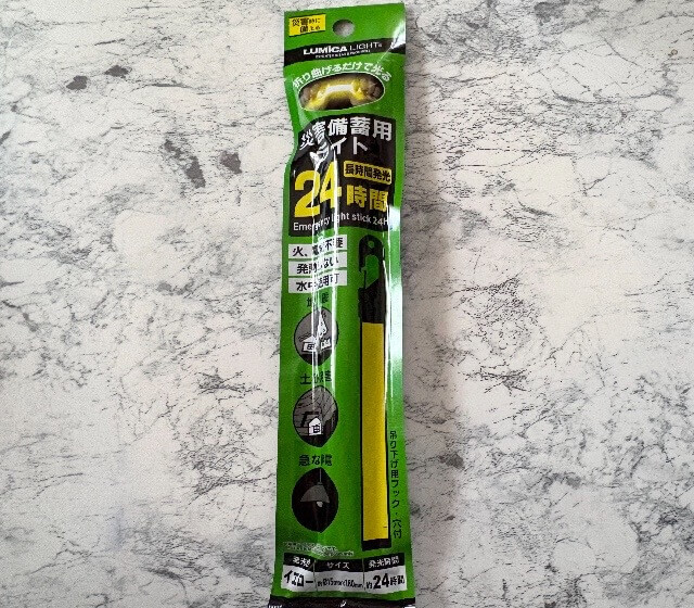 電池が不要で濡れても大丈夫な、パキッと折り曲げて光る災害備蓄用ライトも準備しました。
