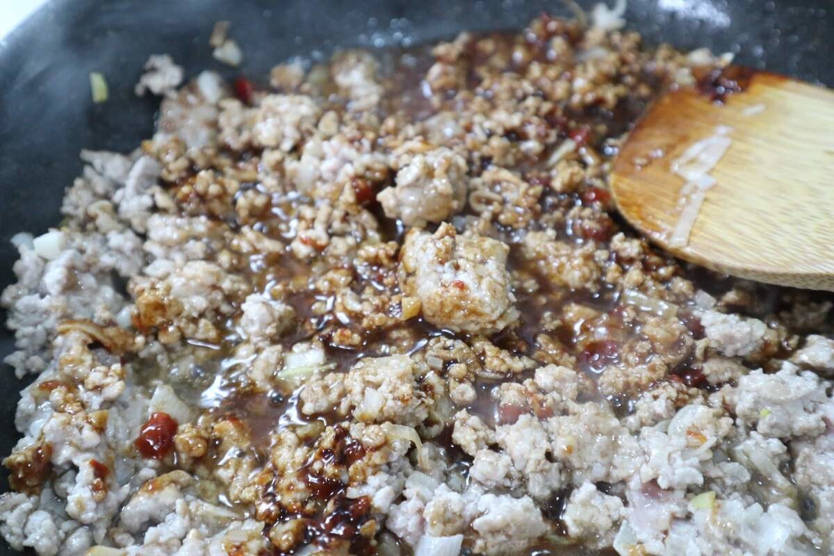 豚ひき肉に火が通ったら【A】を加えて、満遍なく調味料が混ざるように炒めます。
