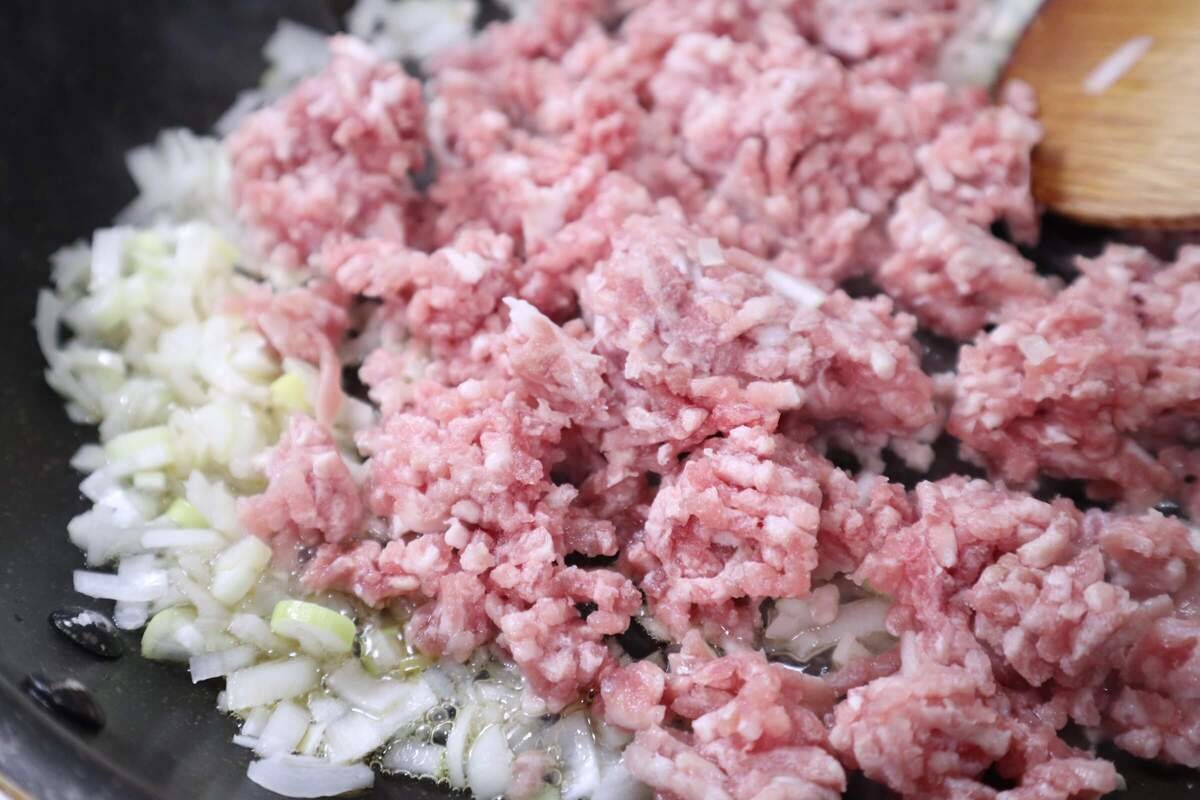 中火にかけたフライパンにごま油をひき、ニンニクと長ネギを加えてニンニクの香りが立ってきたら、豚ひき肉を加えて炒めます。