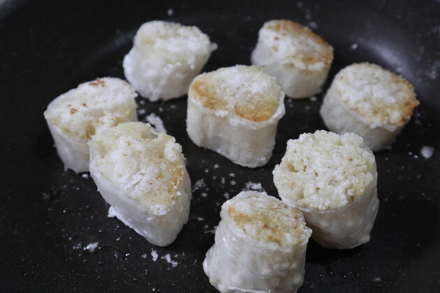 ライスペーパーをぬるま湯にひたして、えのきの半量をしっかりキツく巻き、4等分に切ります。もう一度同様に作り、合計8個にします。