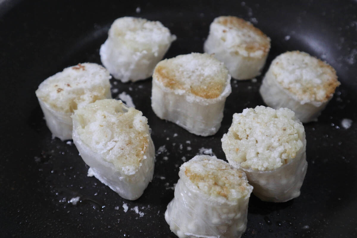 フライパンを中火にかけ、サラダ油をひき①を並べて、火が通り両面こんがりするまで焼きます。