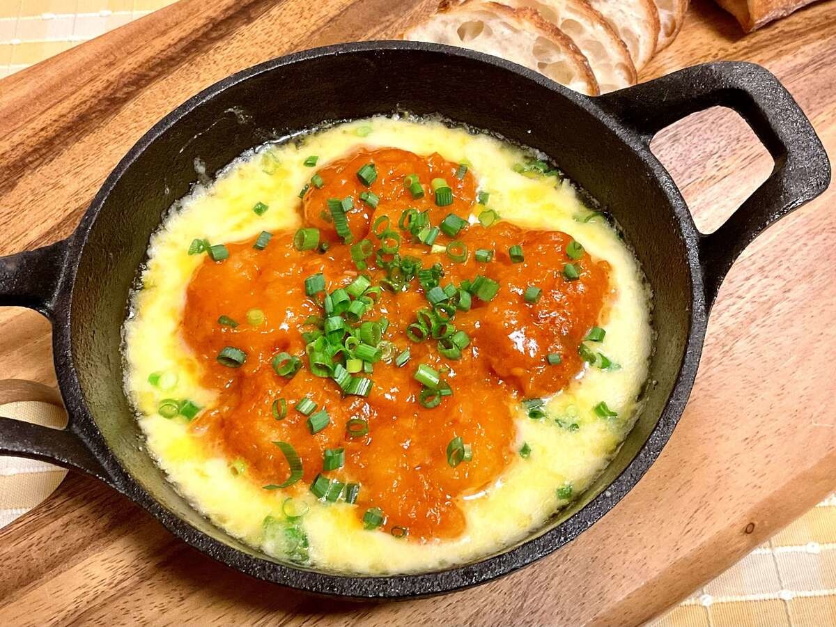 スキレットやフライパンで溶かしたピザ用チーズなどに、温めた海老チリを加えます。そのままでも、パンの上にのせていただいてもおいしくいただけます。