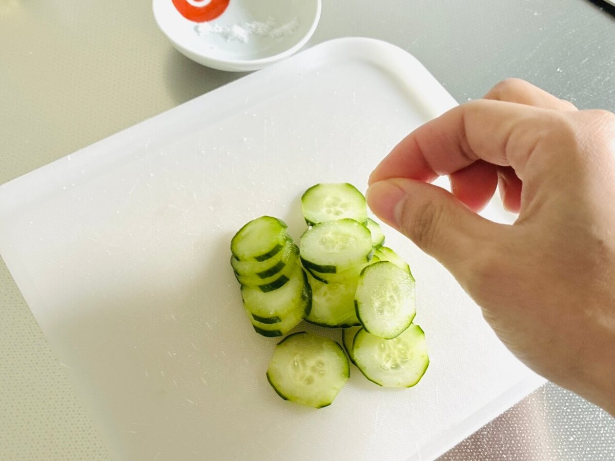 きゅうりはスライスし、軽く塩をふって約10分放置します。