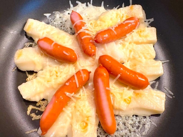 ふたをあけてウインナーを放射状にのせ、チーズをかけ、再びふたをしてさらに3分蒸し焼きにします。