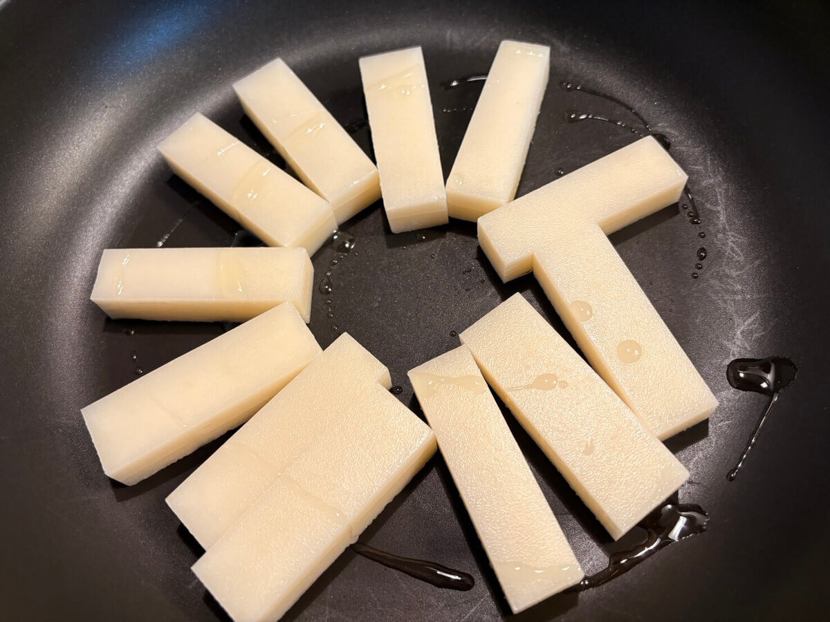 サラダ油を熱したフライパンに切った餅を円形に並べ、ふたをして中火で5分ほど焼きます。