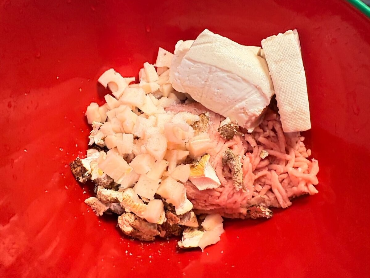 ボウルに鶏ひき肉、れんこん、干ししいたけ、塩、水切りした豆腐を入れます。