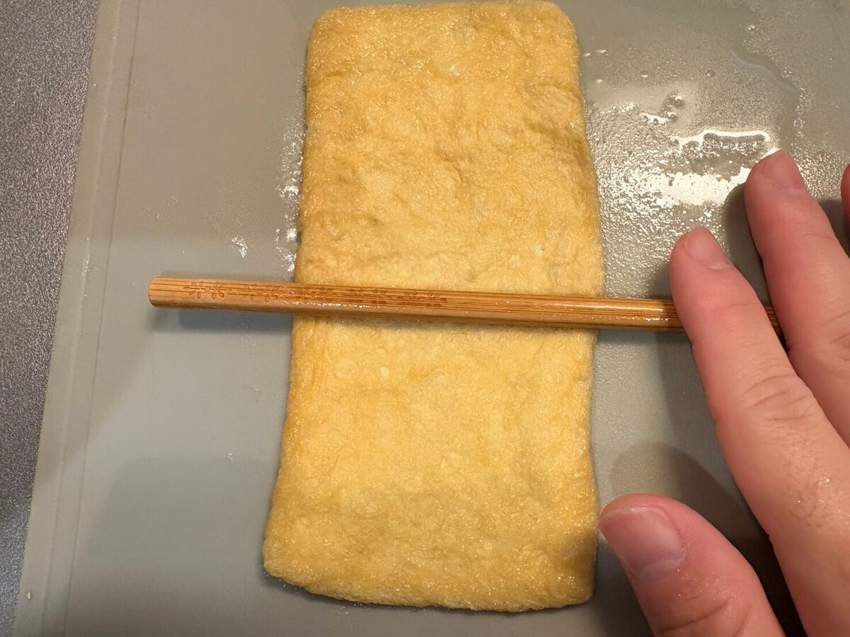 油揚げをまな板の上に縦長に置いて、菜箸をのせて両手で軽く押さえつけながら転がします。