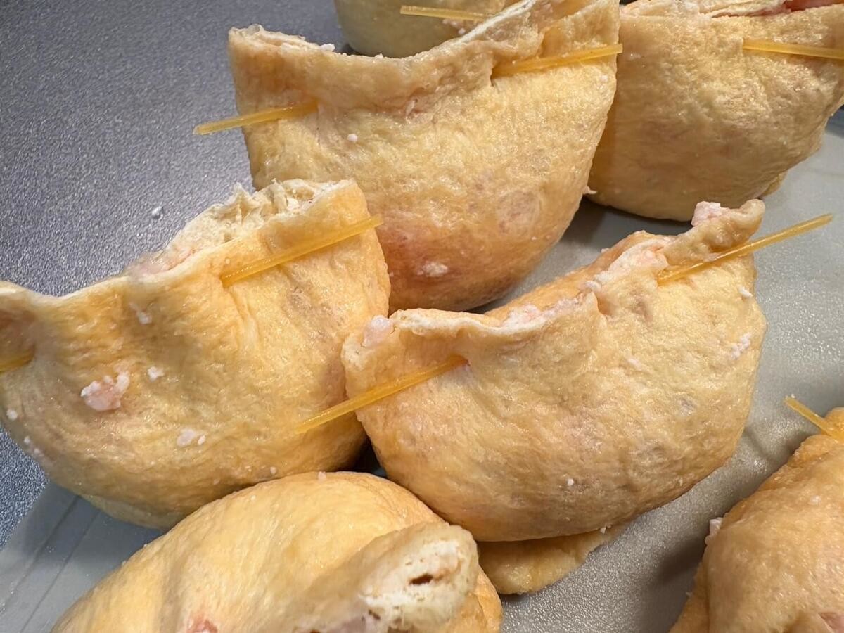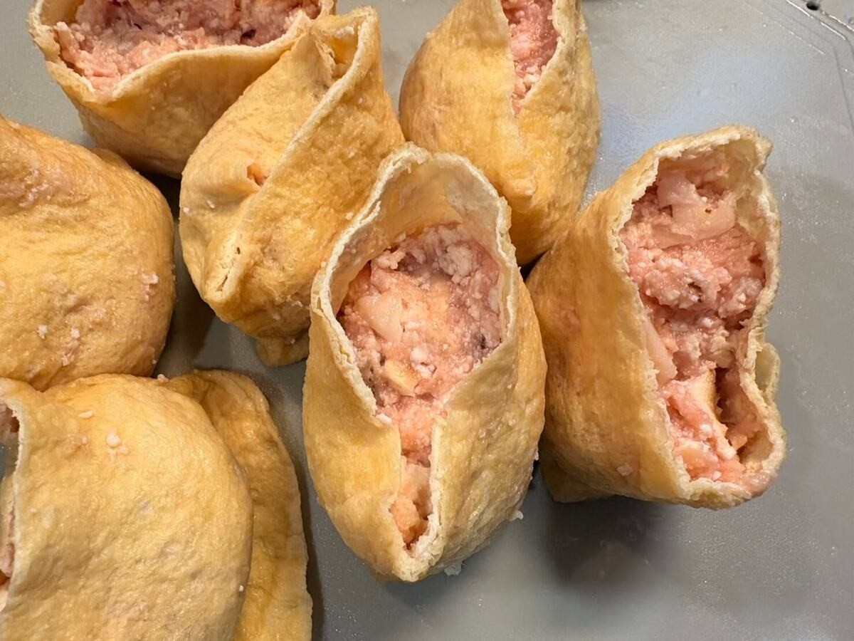 袋状にした油揚げに、作ったタネを8等分にして詰めます。
