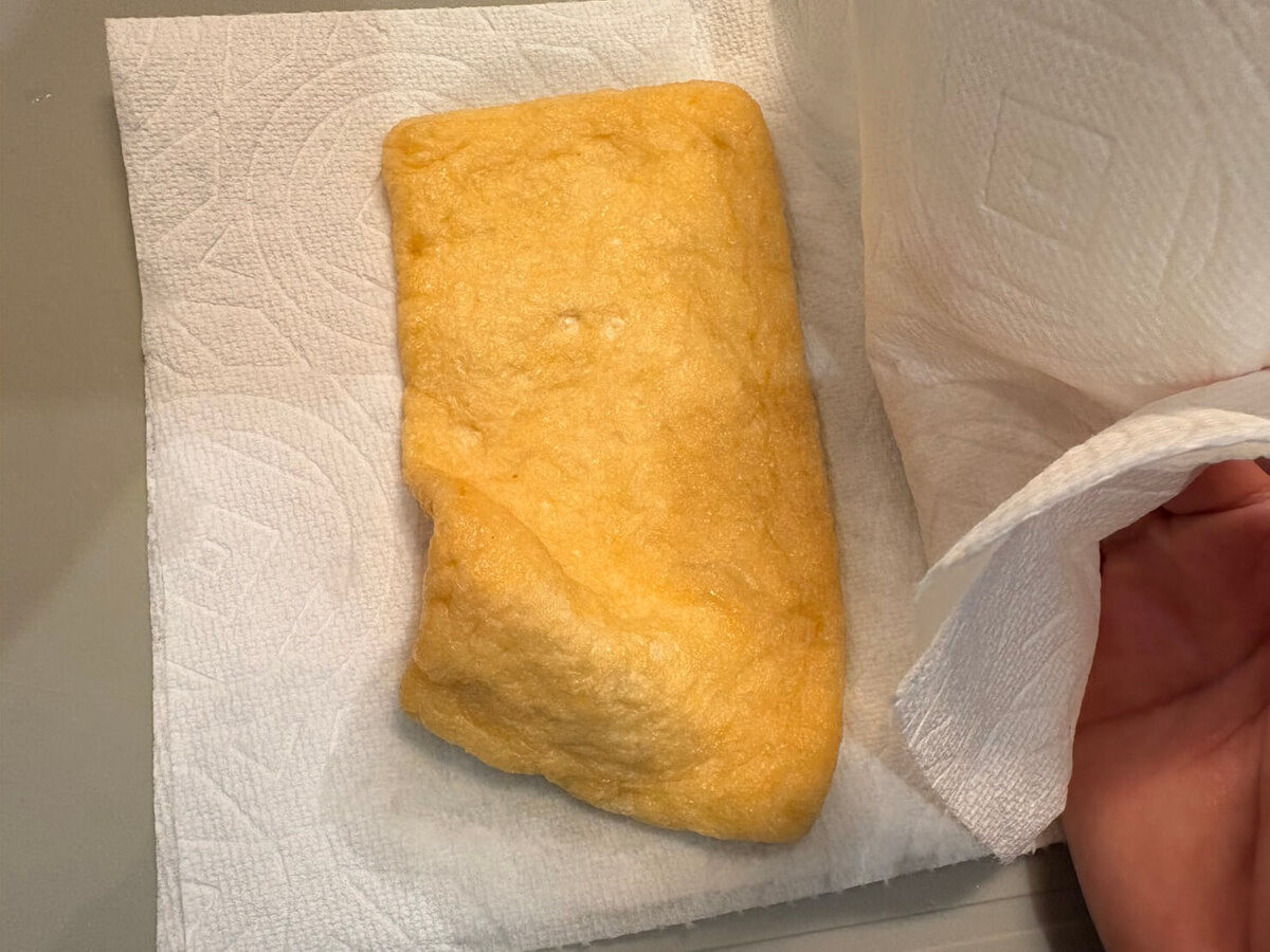 作り方⑤油揚げの水分をとって袋状にする