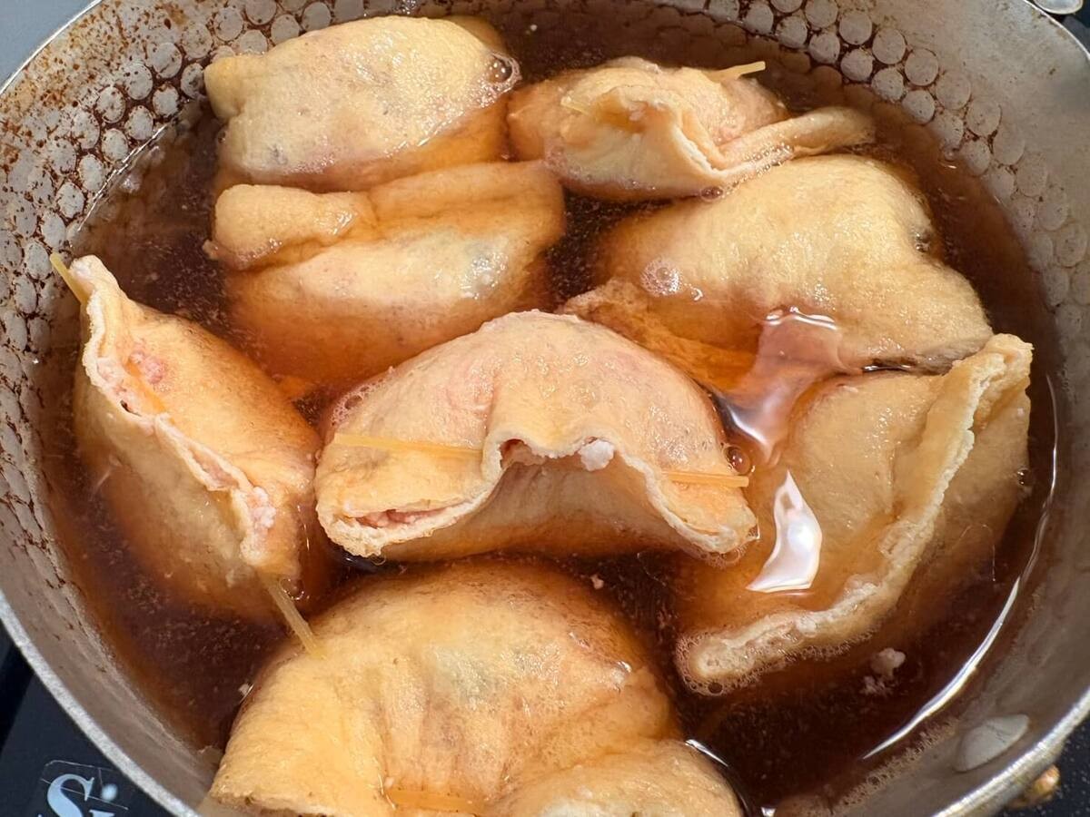 だしの中にタネを詰めた油揚げを入れて中火で20〜30分煮込みます。