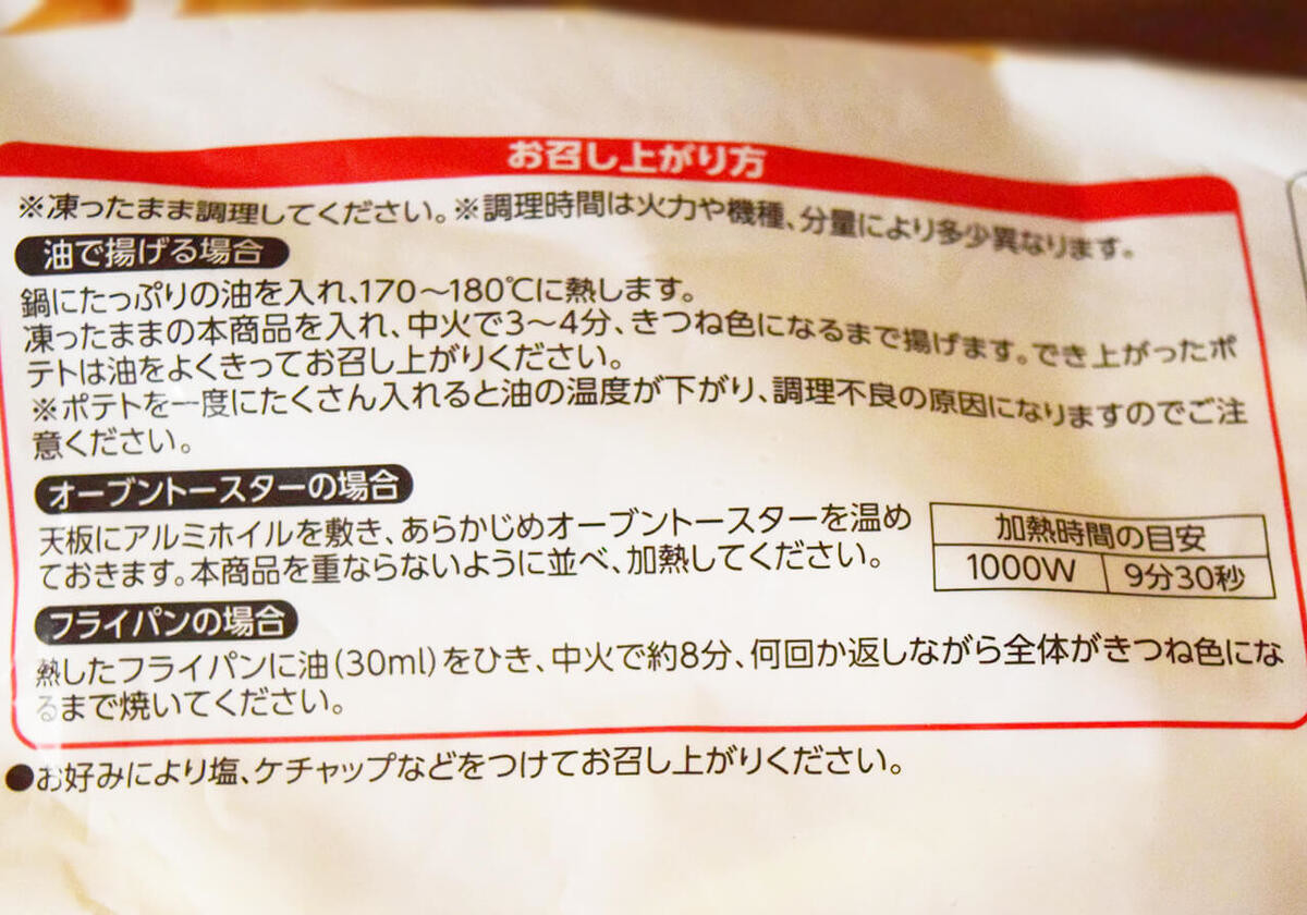 調理方法としては「油で揚げる」「オーブントースター」「フライパン」ですが、今回は「フライパン」調理をして実食することに。