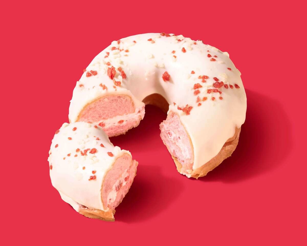 ピンクのドーナツにホワイトチョコとクランチをトッピング。