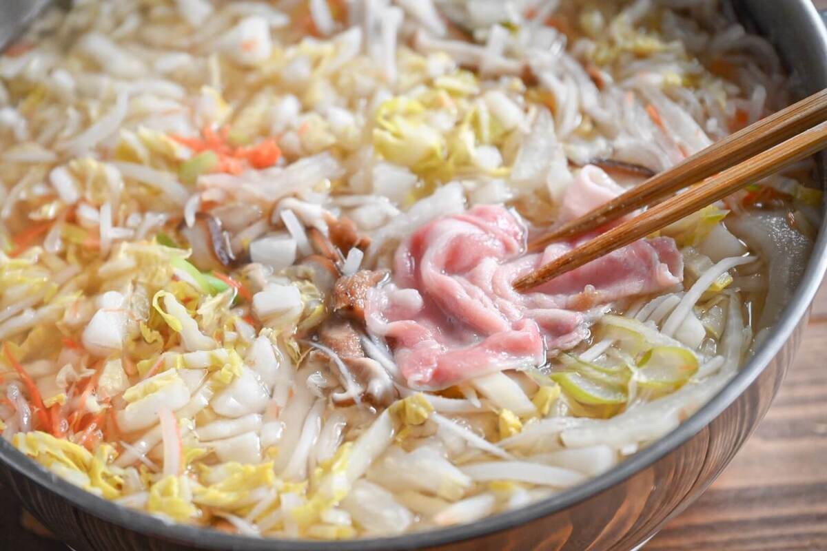 フタをし、もう一度煮立て、すべての具材が汁の中に浸ってから、豚肉を1枚ずつしゃぶしゃぶしていただきました。