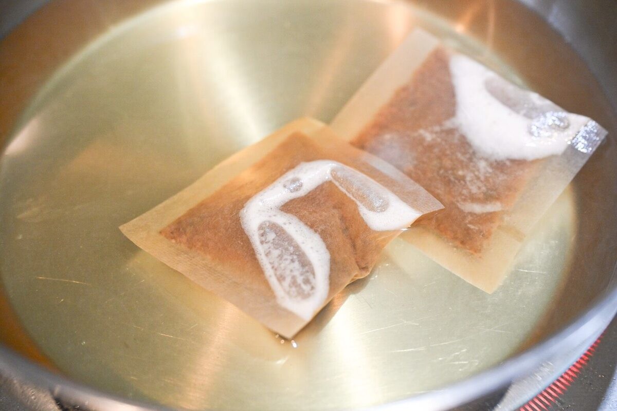 土鍋に水とだしパックを入れ、中火にかけます。