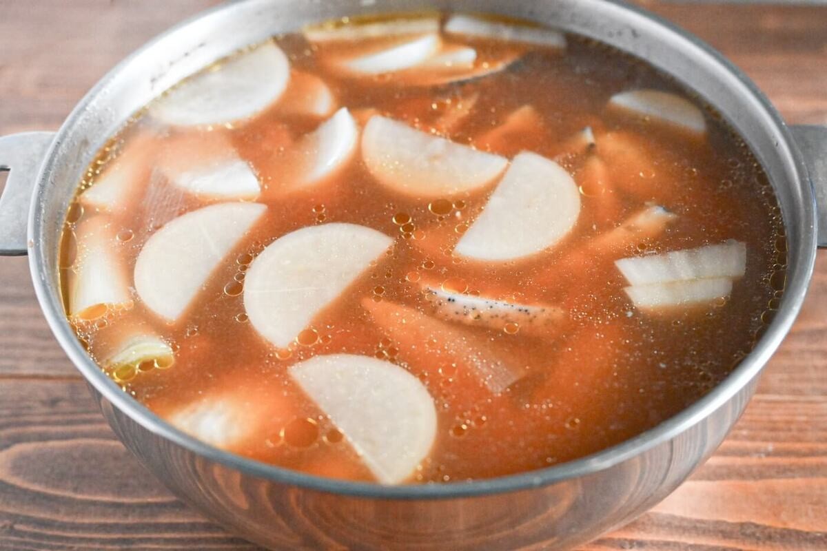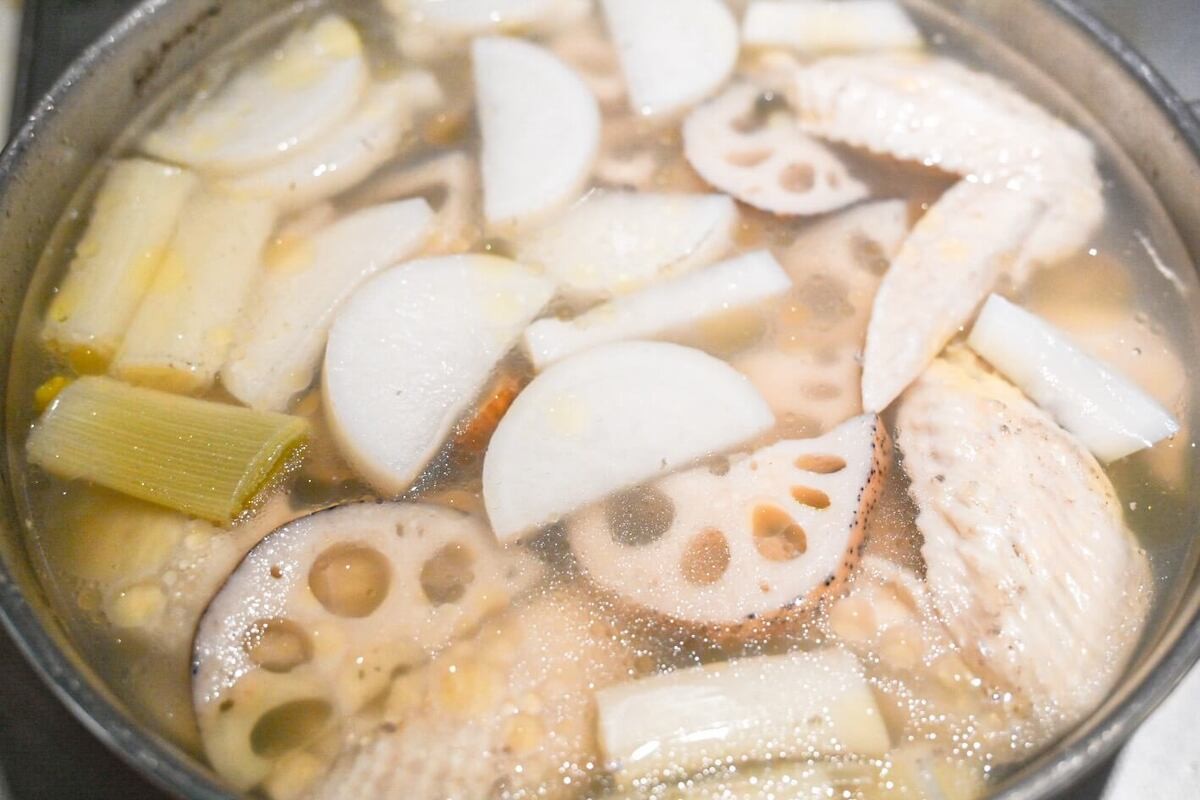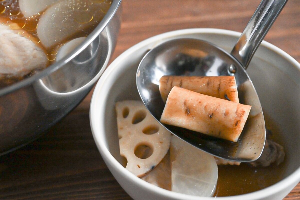大根、れんこん、ごぼう、白ねぎを入れておよそ40分煮込みます。