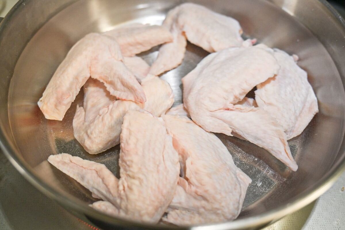 鍋に水1,500mlと手羽先を入れ、中火にかけます。