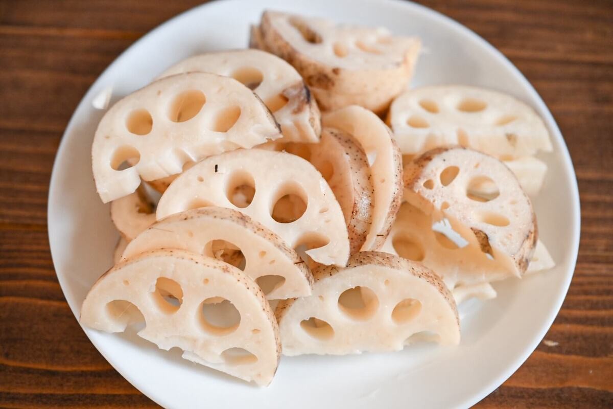 また、太さのあるれんこんを使用したため、輪切りだと切りづらく、半月切りにしました。