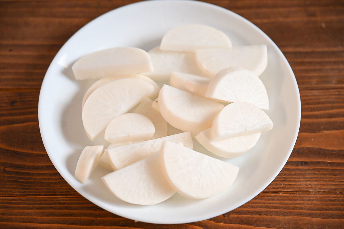 紹介されたレシピでは3cm幅の半月切りですが、筆者はやわらかい大根が好きなので、1cm幅の半月切りにしました。