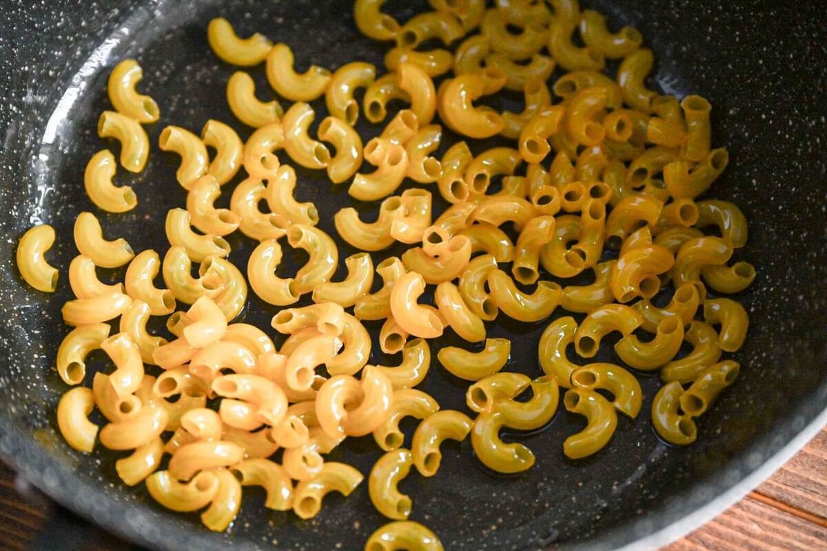 フライパンにマカロニとオリーブオイルを入れて和えます。