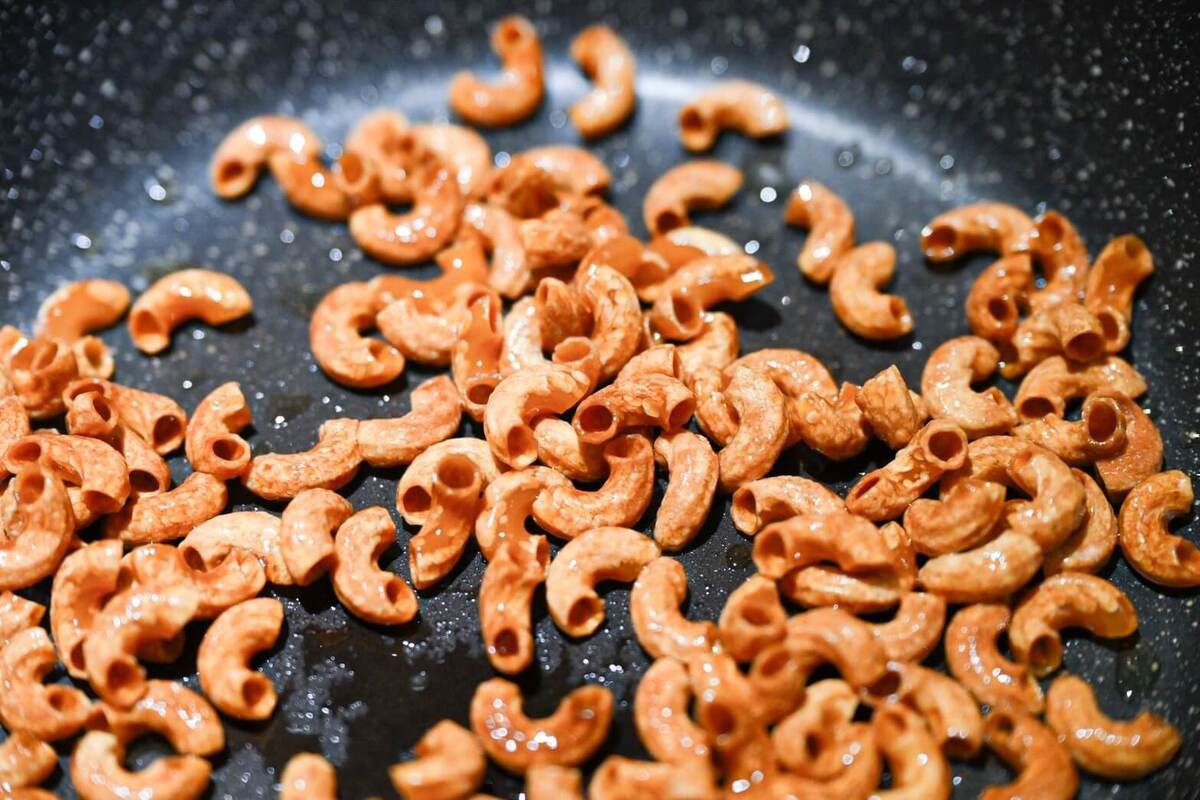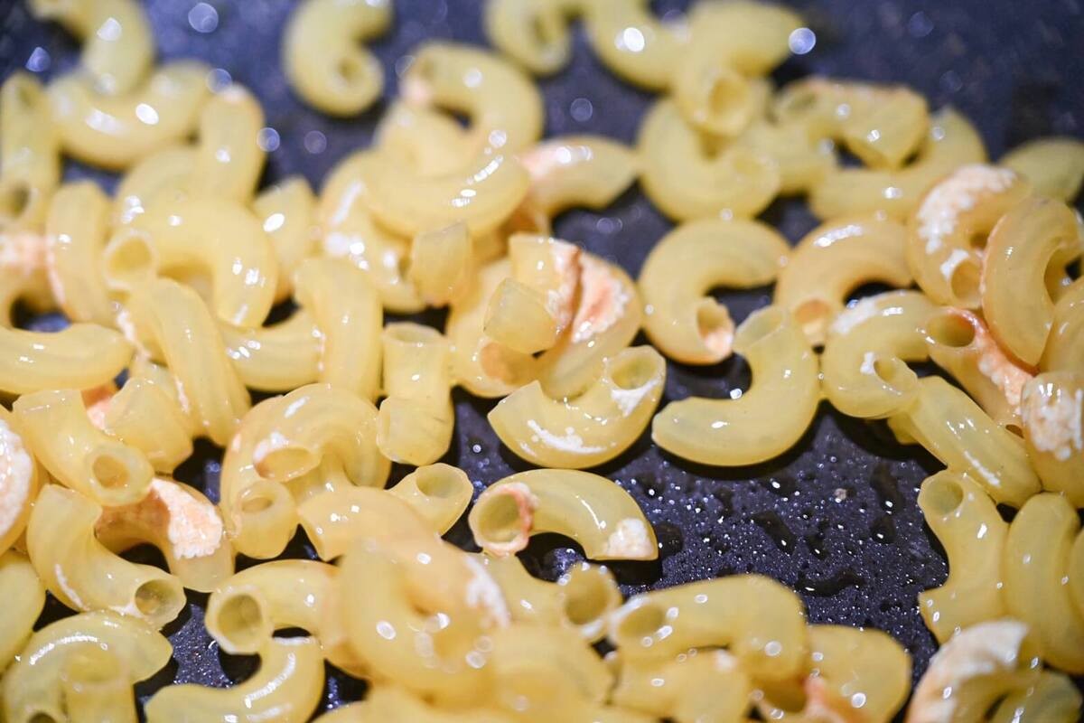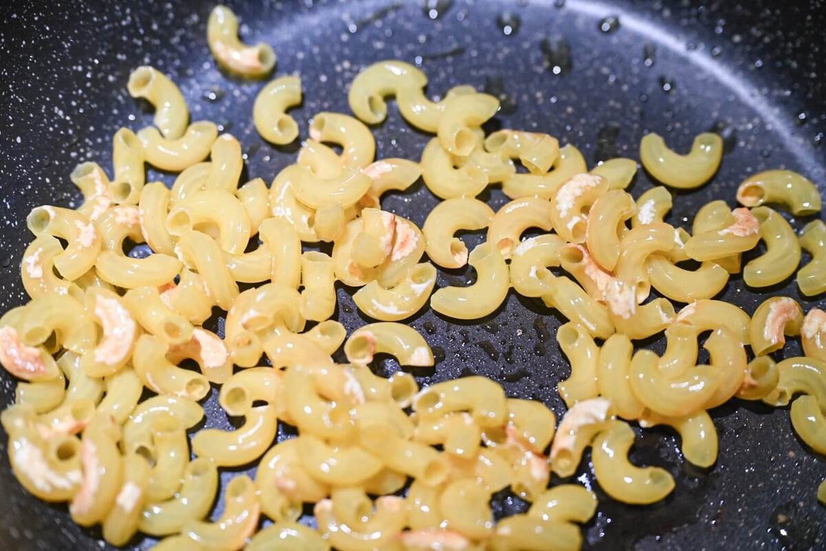 マカロニ全体の色が変わるまで、混ぜ続けながら加熱します。