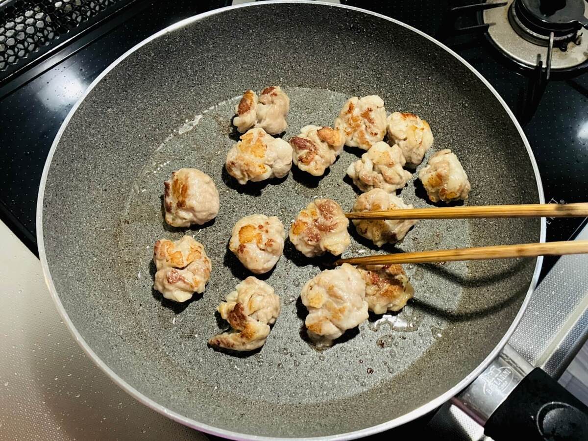 フライパンにサラダ油を入れ、電子レンジ加熱した豚こま切れ肉を転がしながら焼きます。