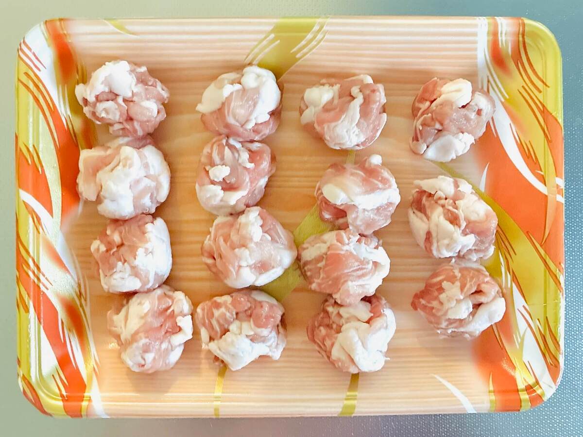 番組では350gの豚こま切れ肉を14個に丸めていましたが、我が家は3人家族なのでひとり5個ずつになるように15個に丸めてみました〜。