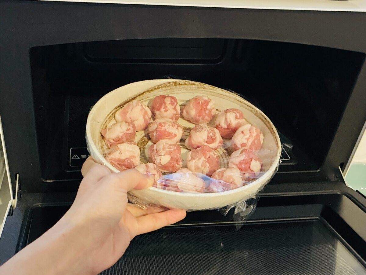 耐熱皿に丸めた豚こま切れ肉を並べ、ラップをかけて電子レンジ500Wで4分加熱します。