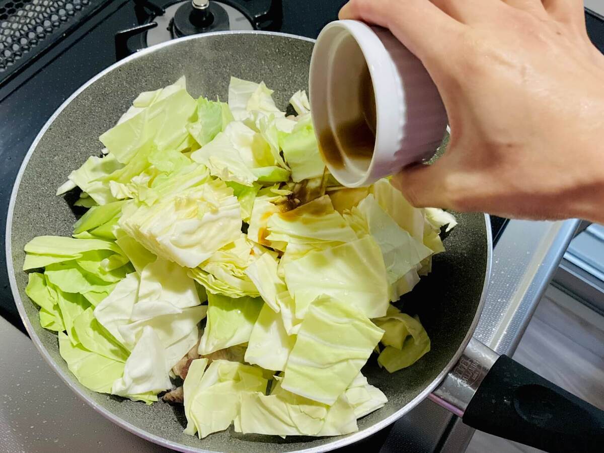 全体に焼き色がついたら、キャベツと照り焼きソースを加えます。
