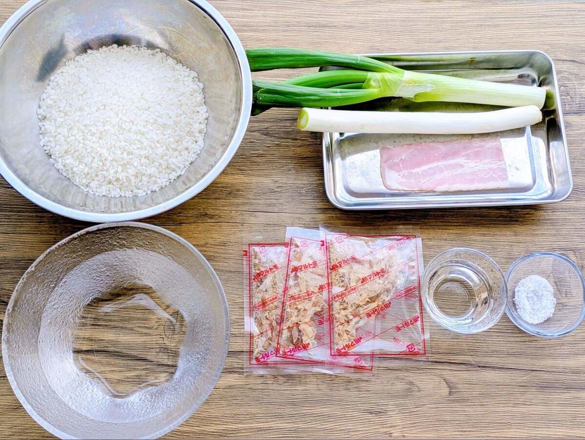 今回作るのは、この書籍で紹介されている「長ねぎとベーコンの炊き込みごはん」。長ねぎを1本丸ごと使うことで、白い部分の甘みと青い部分の香りを存分に楽しめるそうです。