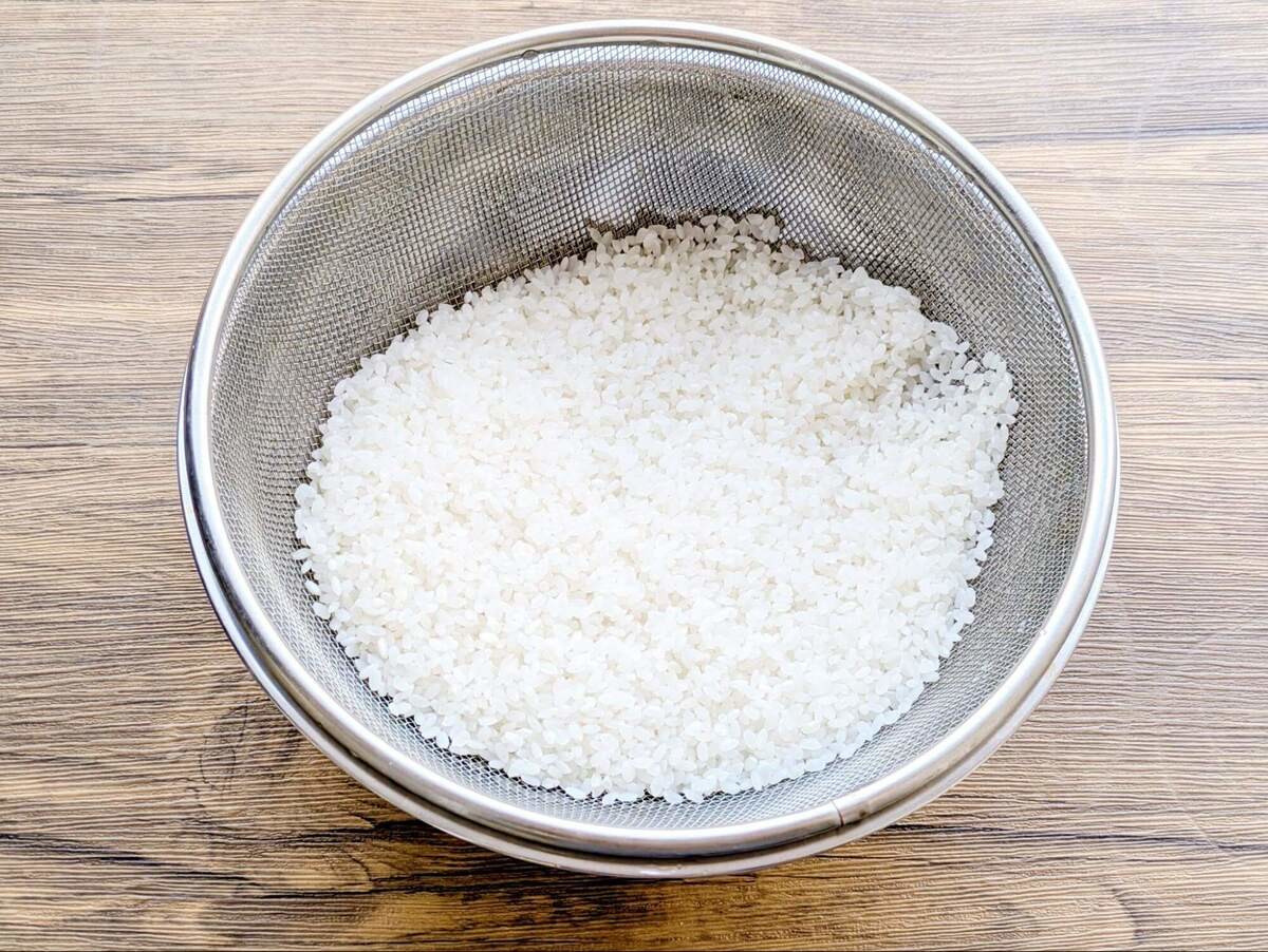 米は洗ってザルに上げ、30分置いておきます。こうすることで、表面についた水分が米の内部に浸透してふっくら炊き上がりますよ。
