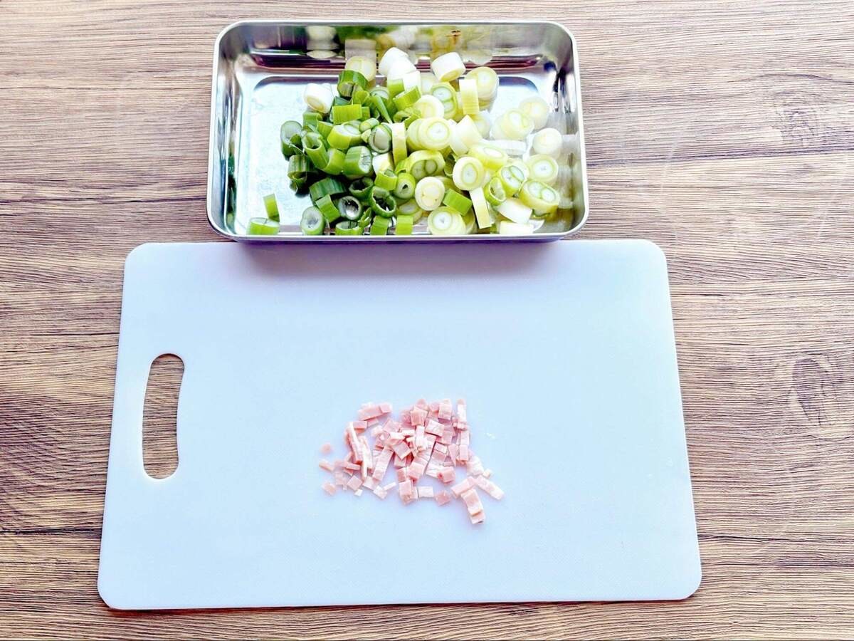 長ねぎは5mm幅の小口切りに、ベーコンは粗みじん切りにしましょう。