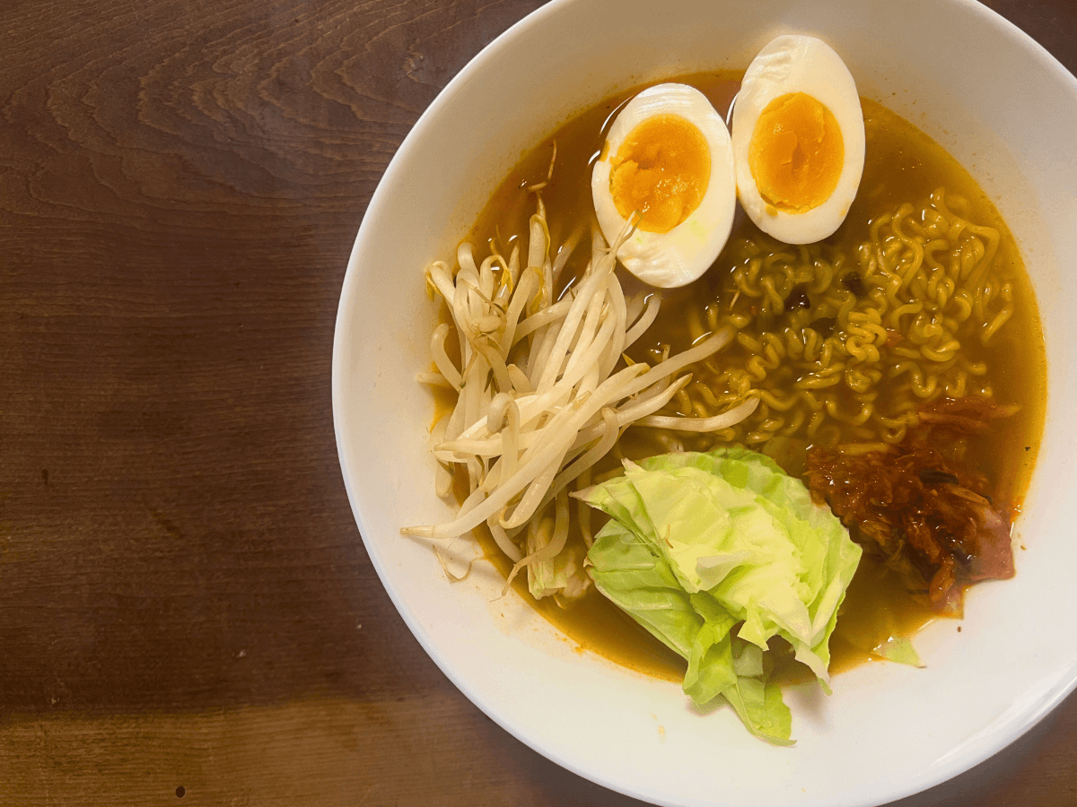 我が家では、ラーメンにもやしやキャベツ、キムチ、そして半熟卵をトッピングしてみました。