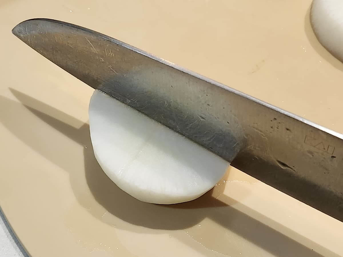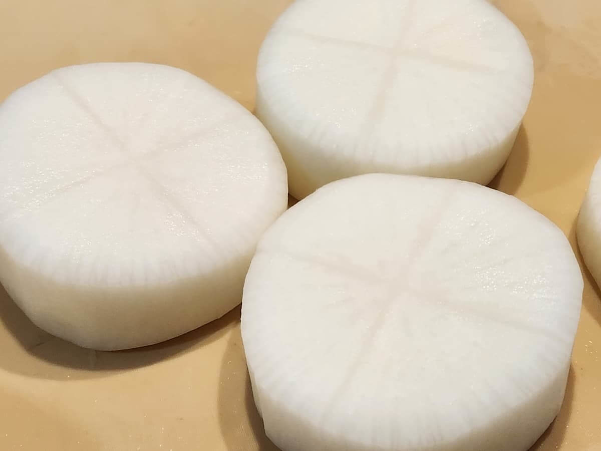まずは通常通り、大根を2〜3cm程度の厚さの輪切りにします。