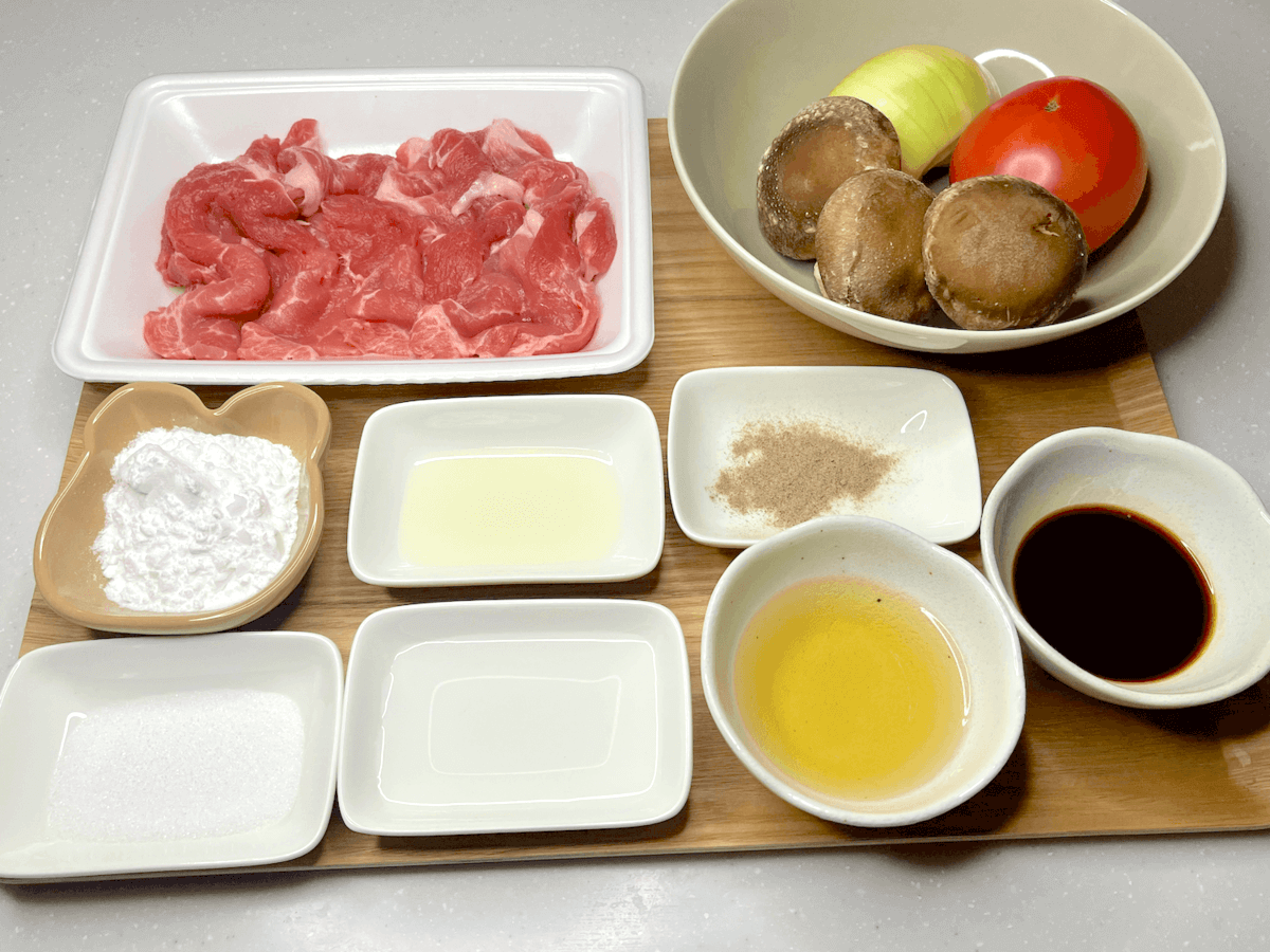 - 〔材料の下準備〕玉ねぎ、しいたけ、トマトをそれぞれ切り、水溶きかたくり粉も作っておきます