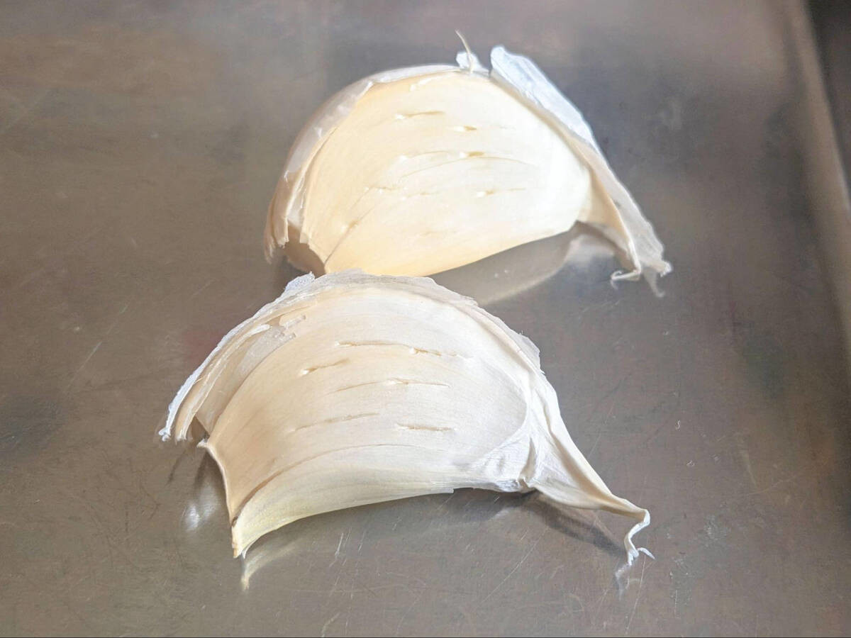 ニンニクの皮は剥かず根元だけ切り、包丁で全体に切り込みを入れます。