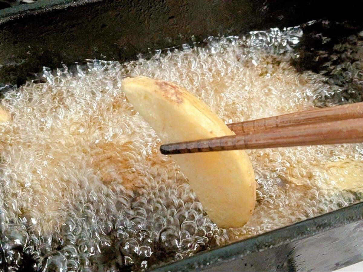 弱めの中火で軽く温めたあと弱火に切り替え、火を通します。低温の油でじっくり火を通すことで、旨みと甘みを最大限に引き出せるのだとか。