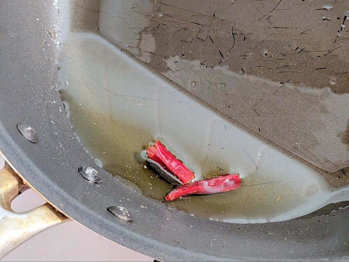 辛いものが好きな方は、種を取り除いた唐辛子を②のフライパンに入れます。辛みと風味が油に移ったら、焦げる前に取り出しておきましょう。
