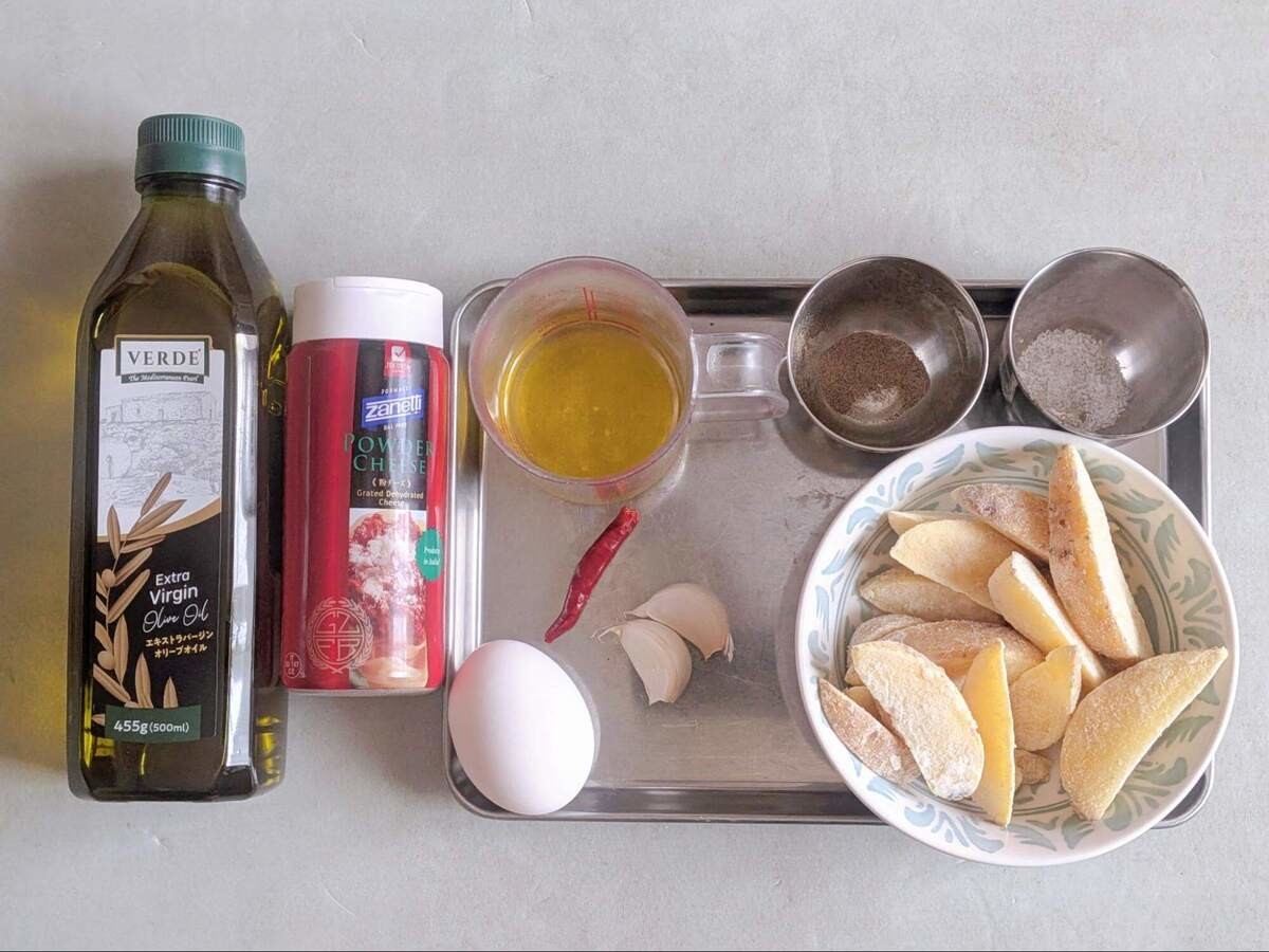 料理が冷めないよう電子レンジで温めた皿にニンニク、フライドポテト、唐辛子を盛り付けます。