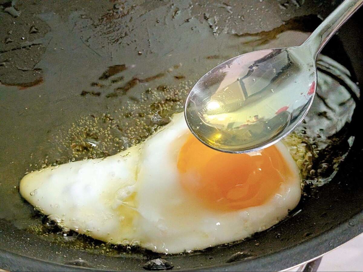 黄身がちょうどよいかたさになるまで、スプーンで油をかけながら火を通します。黄身がぷるぷるになったら、取り出しましょう。この時は弱火で約4分加熱しました。