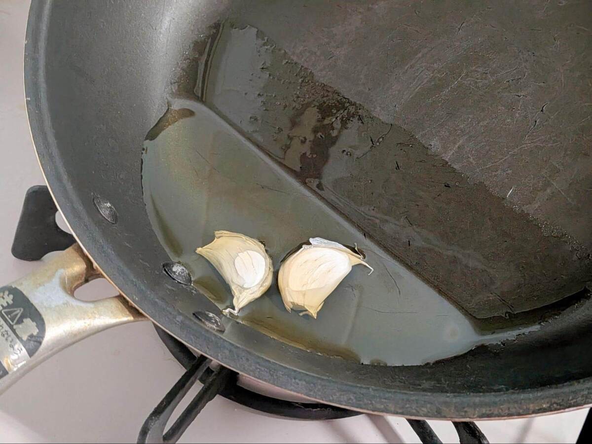 フライパンにピュアオリーブオイルとニンニクを入れます。フライパンを手前に傾け、オリーブオイルに浸るようにしましょう。