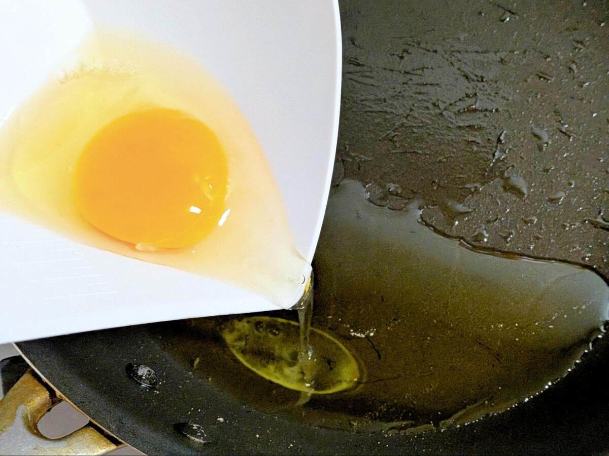 同じフライパンにエキストラバージンオリーブオイルを加え、卵を入れてください。油が跳ねるため、別容器に割ってから静かに入れましょう。