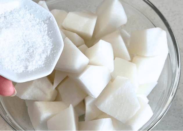 大根は皮をむいて乱切りにし、ボウルに入れて塩大さじ1をまぶします。