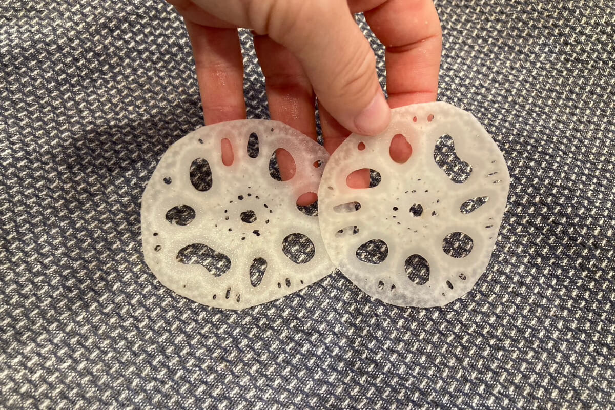 レンコンもやってみました。レンコンの方が簡単に綺麗にスライスできました!